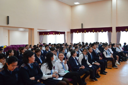 Жорабекова Бахытгул Кыдыралиевнаның ұйымдастырумен ЮПБ инспекторы капитан полициясы Ахметова Гульмира Каиыржанқызы қатысумен 8-10 сынып оқушыларына « Өз құқығыңды білгенің –дұрыс өмір сүргенің » тақырыбында «Адалдық сағаты» өтті.