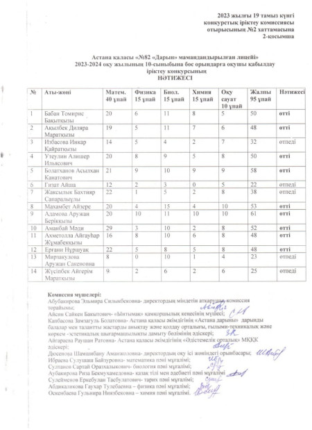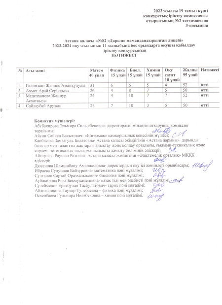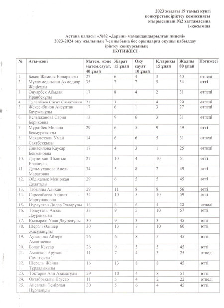 Астана қаласы «№82 «Дарын» мамандандырылған лицейі» 2023-2024 оқу жылының бос орындарға оқушы қабылдау7 сынып