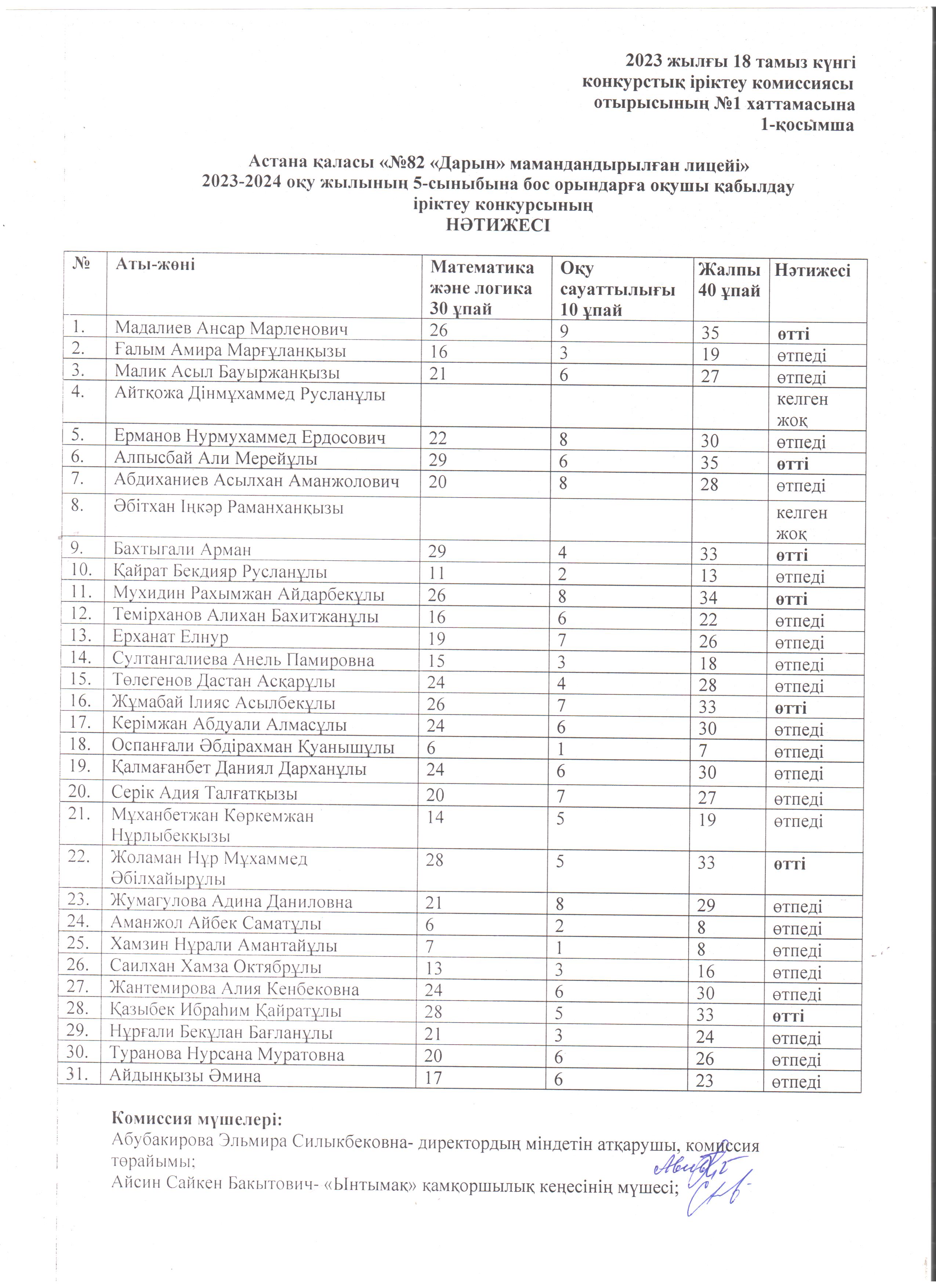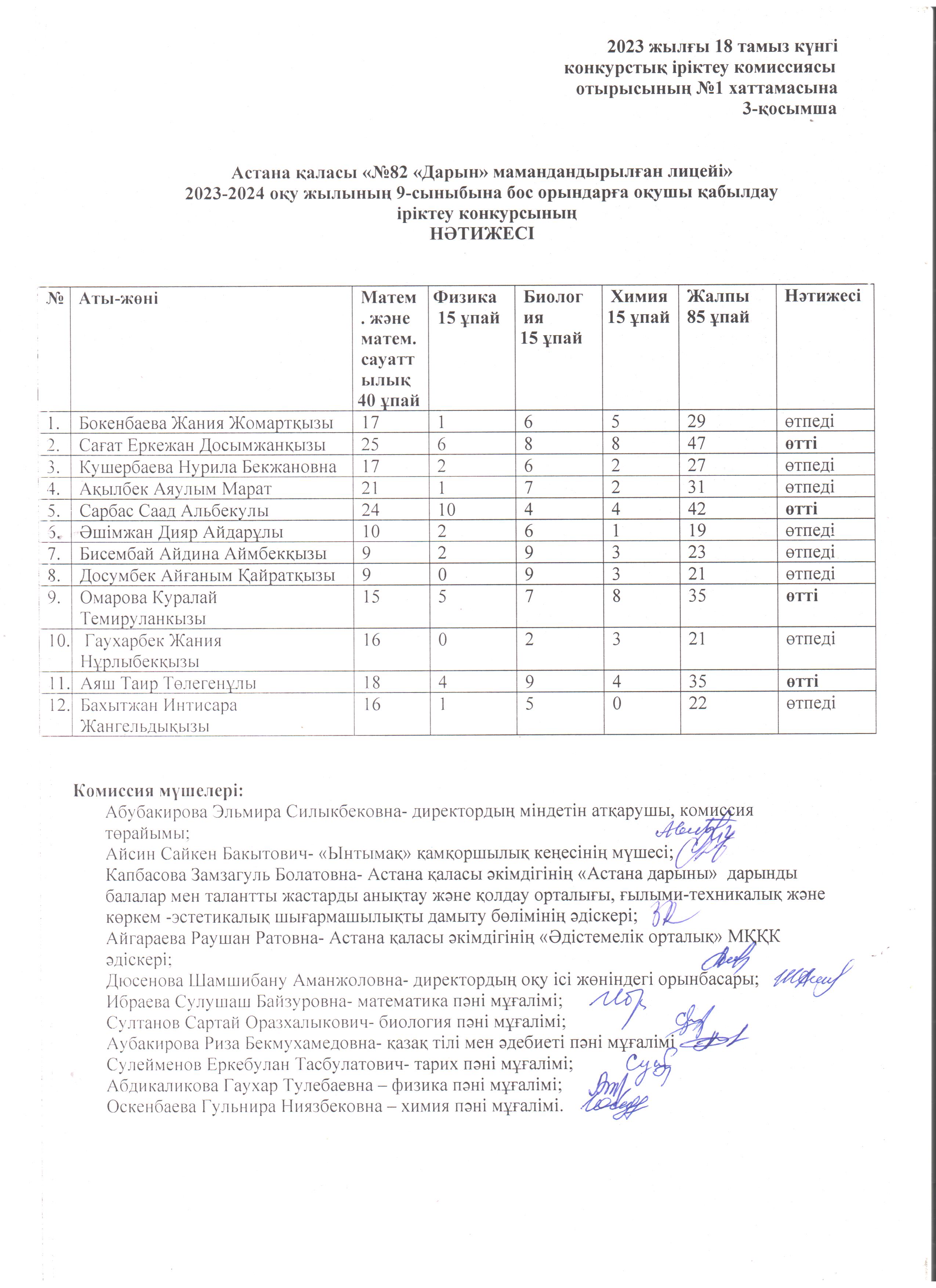 Астана қаласы «№82 «Дарын» мамандандырылған лицейі»2023-2024 оқу жылының 8 -сыныбына бос орындарға оқушы қабылдауіріктеу конкурсының НӘТИЖЕСІ5 сынып